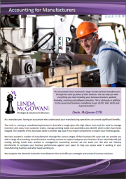 The manufacturing industry is challenging but can be very rewarding. All business owners need to budget, plan, and monitor their business' performance. We know the pitfalls of manufacturing and look forward to working with you to build your business and grow your wealth. Our unique Business Accelerator Process is all about fast tracking your business success and the team at Linda McGowan Pty Ltd offer you a range of accounting, taxation, marketing and business coaching services including: