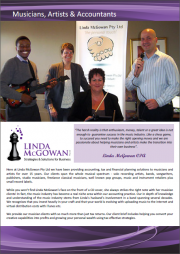 While you won’t find Linda McGowan’s face on the front of a CD cover, she always strikes the right note with her musician clients. In fact, the music industry has become a real niche area within the practice. Her in depth knowledge and understanding of the industry stems from her husband’s long term involvement in a band spanning several decades. She recognises that you invest heavily in your craft and that your world is evolving with uploading music to the internet and virtual distribution costs with itunes, mp3 and cdbaby.