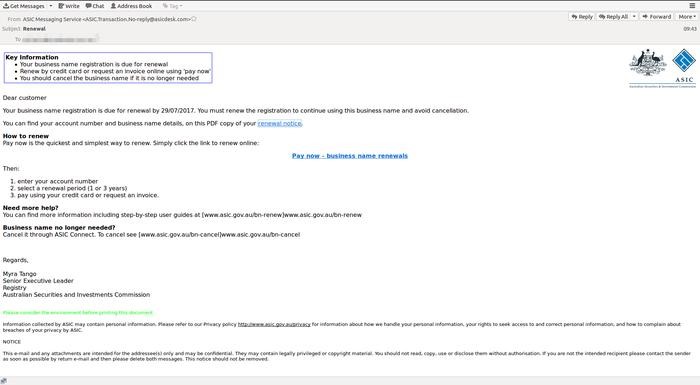 Refer to our previous article on Cyber Safety, the take home message is that any email lacking personalisation, demanding payment or including an invoice should be carefully reviewed. ASIC issue their renewal notices 30 days prior to your renewal date. Rather than clicking on any link, login separately to your ASIC online account using ASIC Connect to look up and check when your business name is due for renewal.
