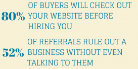 solicitors, accountants and consultants. Their research says 80% of professional service ‘buyers’ check out your website before engaging your services. Incredibly, they also suggest that 52% of referrals rule out a firm before they even talk to them. Why? Because their website makes the wrong first impression and doesn’t spell out how they can help them. That means you might be getting referrals from satisfied clients but when they check out your online presence it’s a wipe out. You won’t even know that you got the referral because the person didn’t reach out to you. You might work super hard to get referrals only to find your website (or lack thereof) has shot you in the foot.